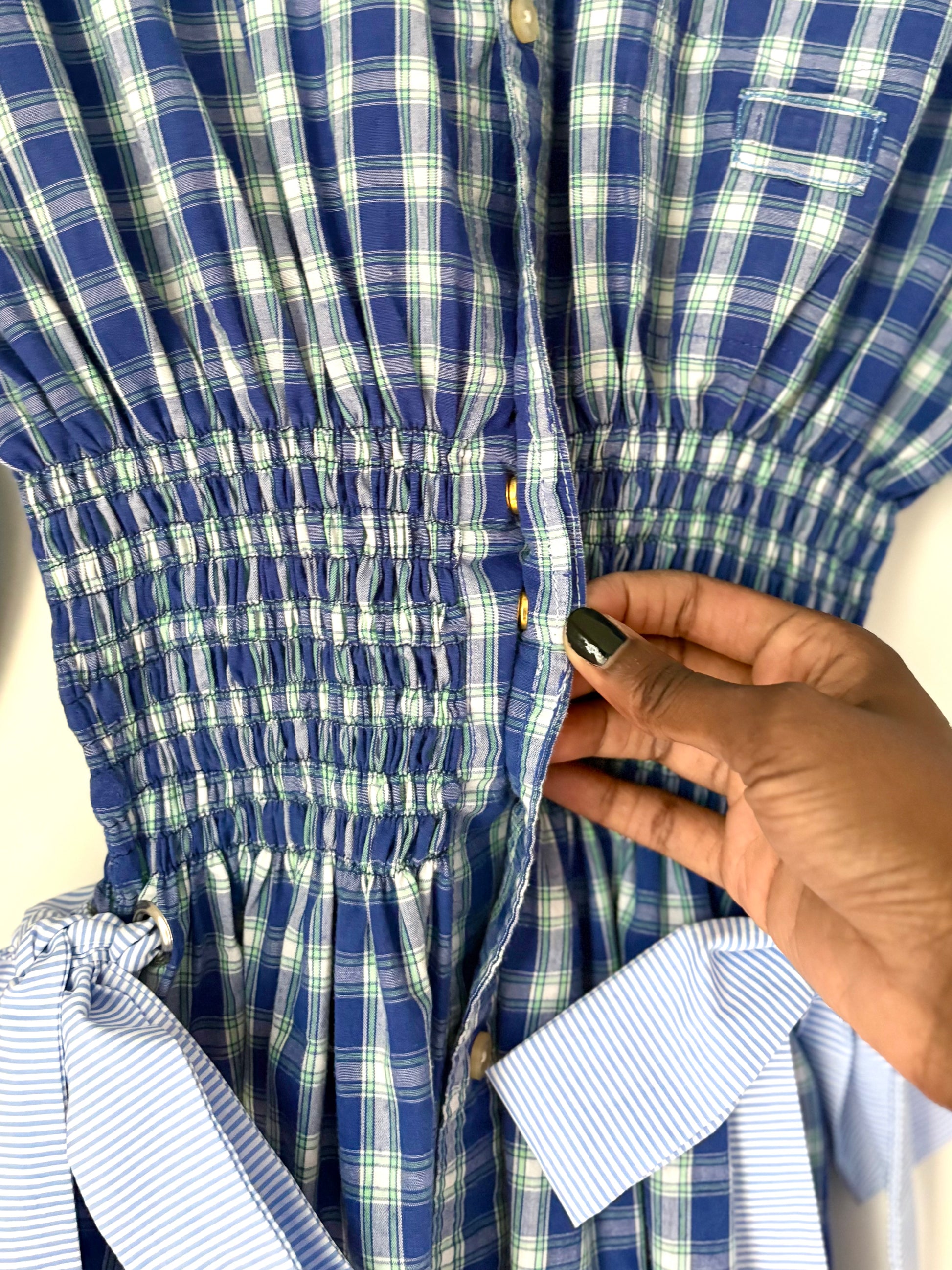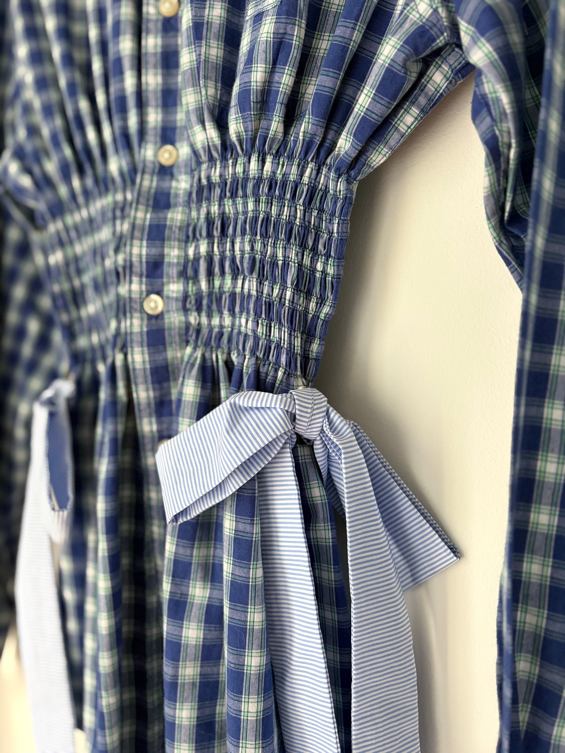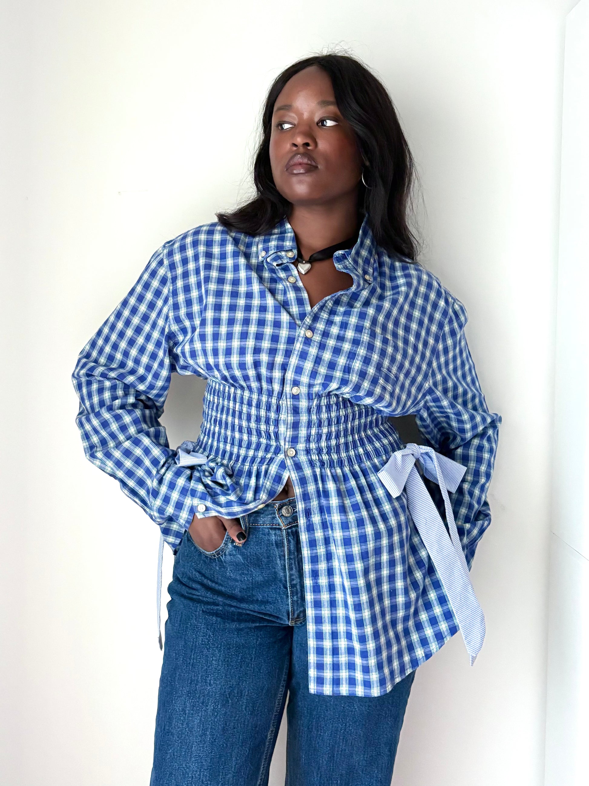 This cerulean blue and white plaid shirt with classic blue and white stripe sashes -- in a similar fabric from Hansel's Cotton Short collection -- is a vibrant spin on the button-down shirt. It features shirring at the waist point to give you shape, with brass snap closures in the center to circumvent any gaps. Removable sashes rest in brass grommets on each side, adding to its customizability by giving the wearer creative liberty to style as they see fit.