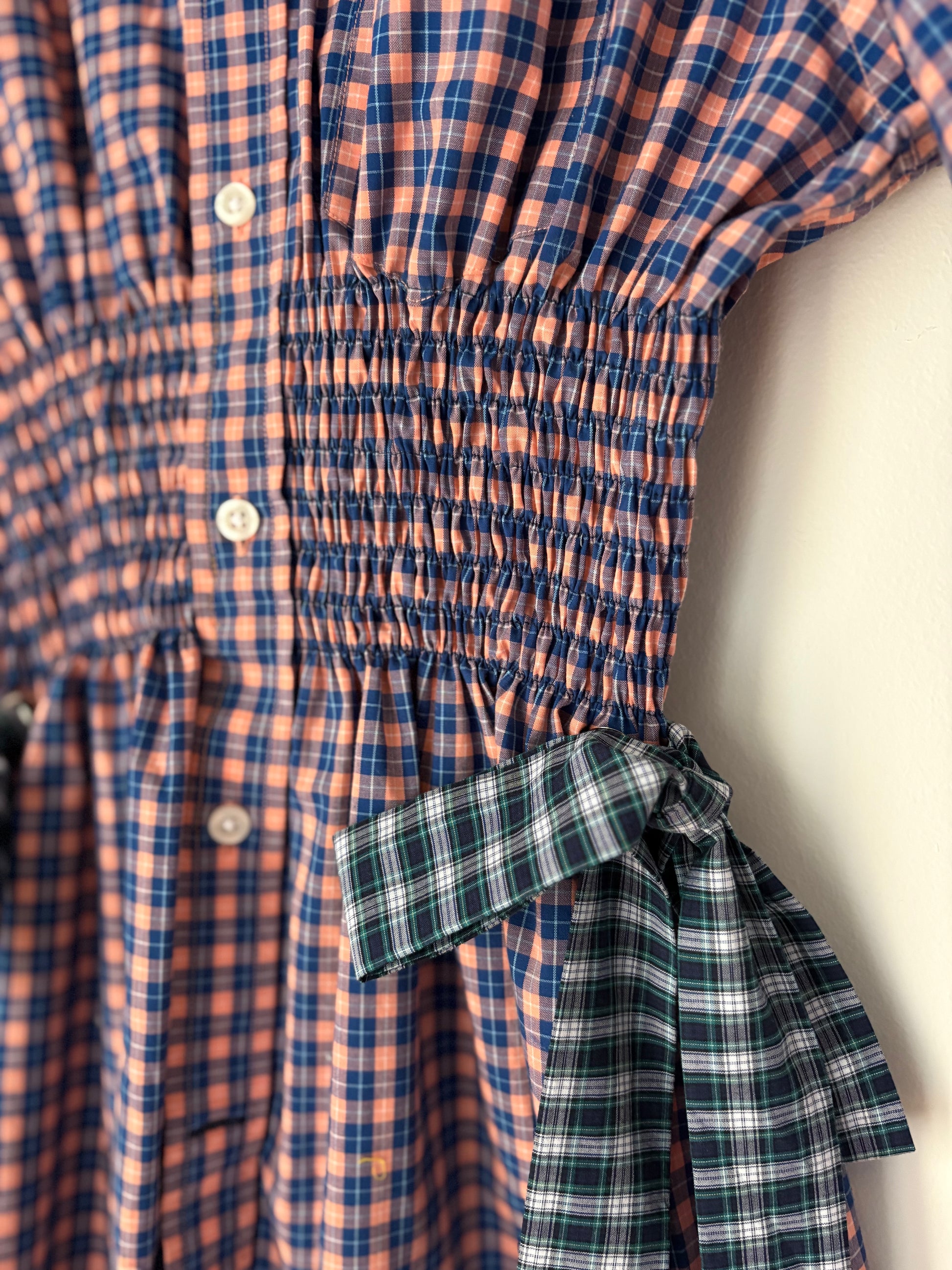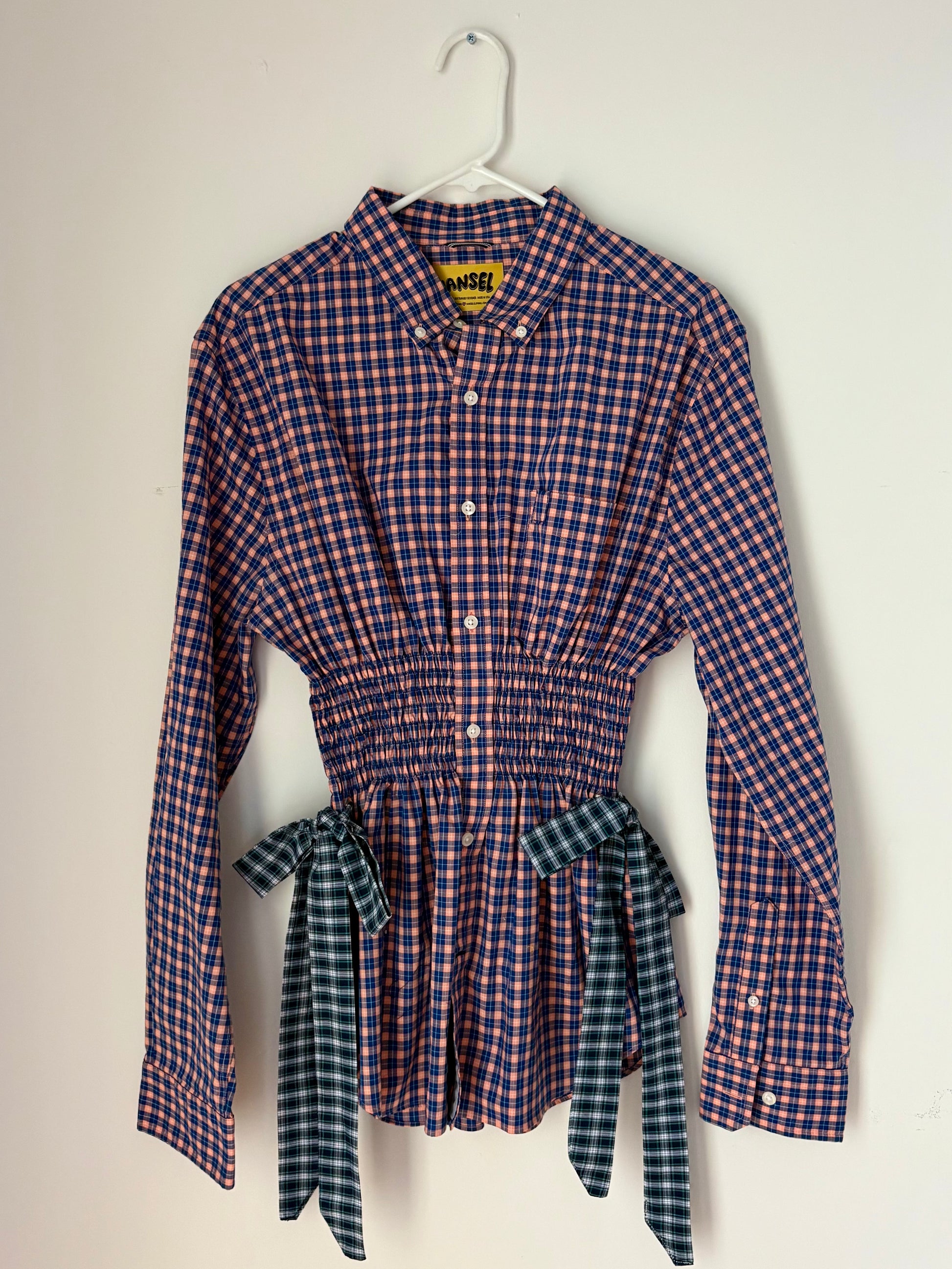 A vibrant blue and orange plaid button-down with forest green sashes, in the same fabric from Hansel's Cotton Short collection -- this gorgeous spin on the button-down shirt makes a statement. It features shirring at the waist point to give you shape, with brass snap closures in the center to circumvent any gaps. Removable sashes rest in brass grommets on each side, adding to its customizability by giving the wearer creative liberty to style as they see fit.