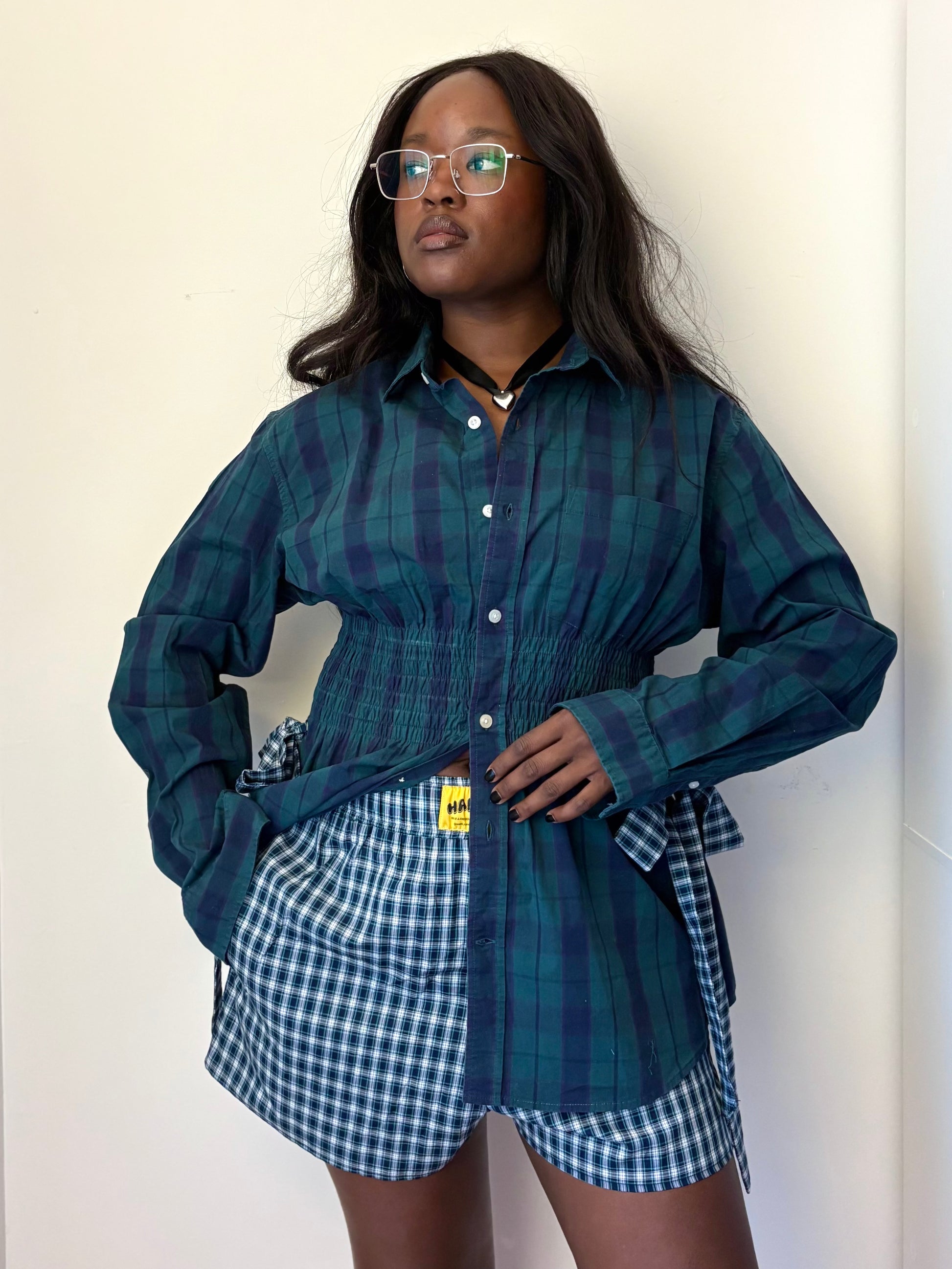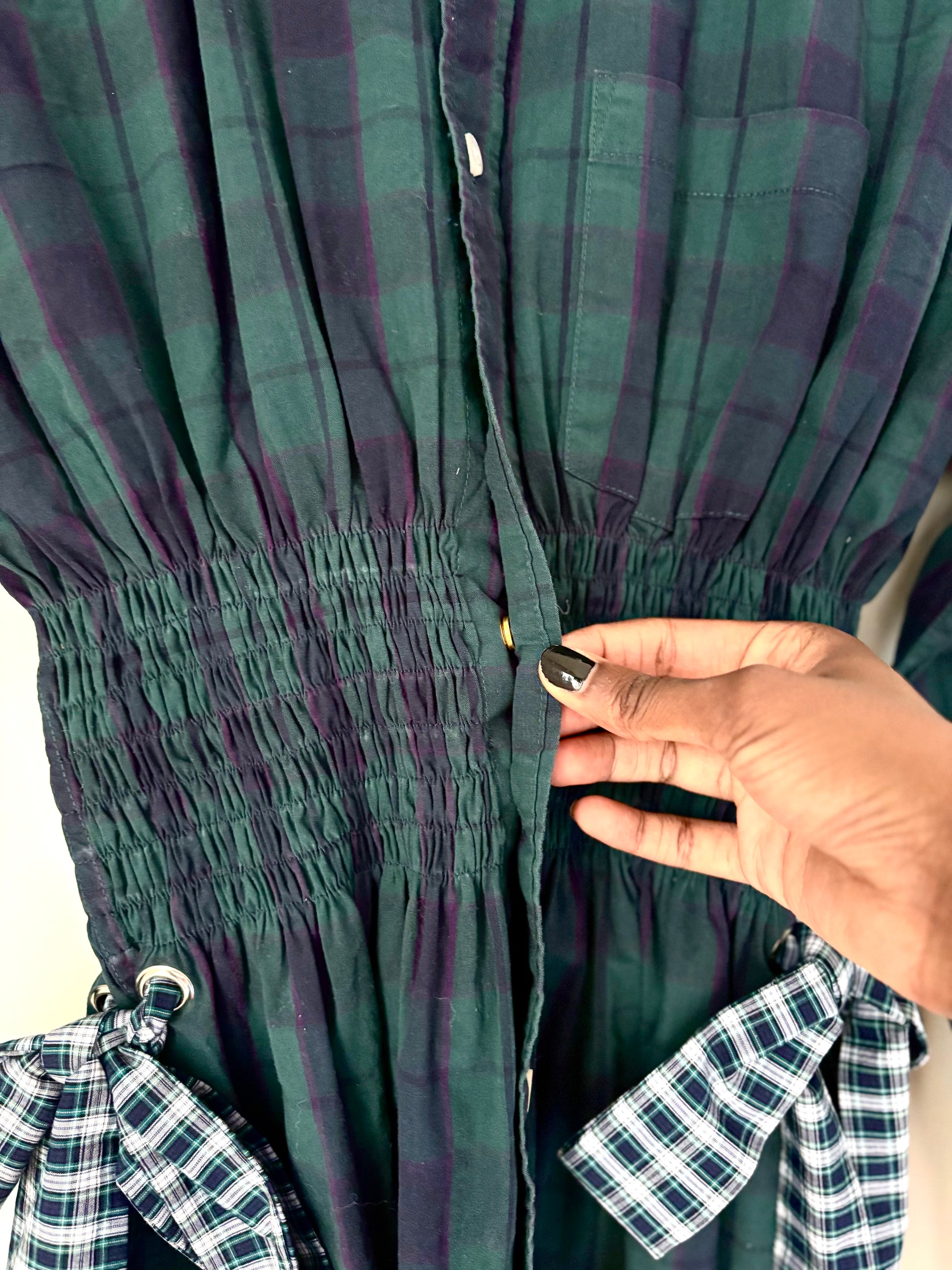 This moody forest green plaid button-down with forest green sashes -- in the same fabric from Hansel's Cotton Short collection -- is a romantic spin on the button-down shirt. It features shirring at the waist point to give you shape, with brass snap closures in the center to circumvent any gaps. Removable sashes rest in brass grommets on each side, adding to its customizability by giving the wearer creative liberty to style as they see fit.